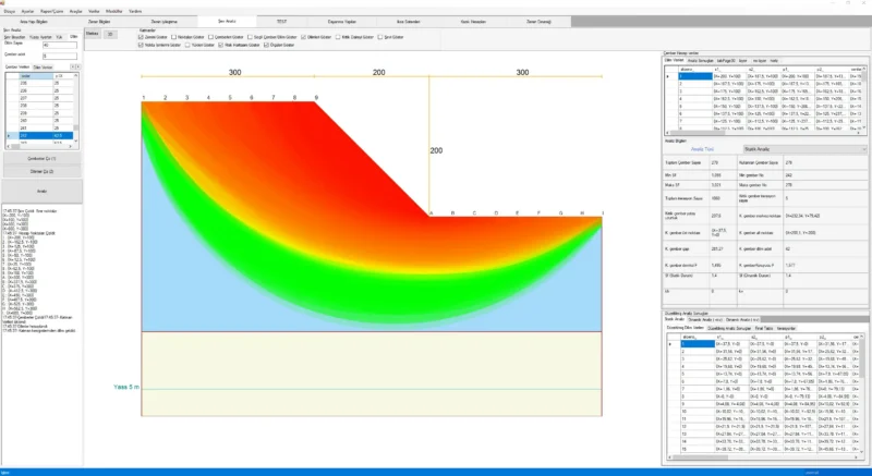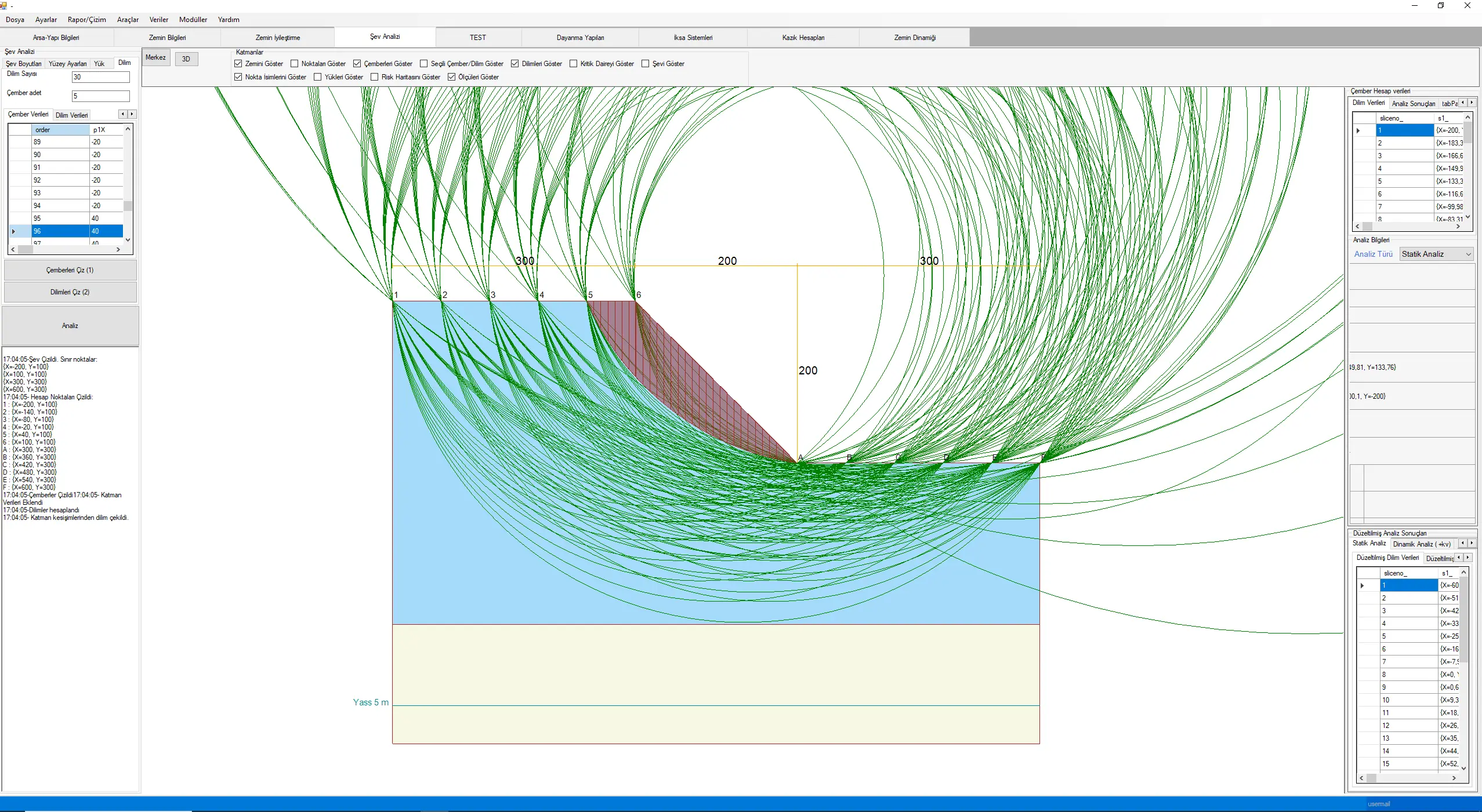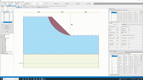 Yazılım, kullanıcının girmiş olduğu şev geometrisi ve yükleme koşulları üzerinden otomatik olarak yüzlerce farklı çemberi dilimlere ayırarak iteraston ile binlerce analiz yapar ve farklı kayma dairelerini inceleyerek en kritik ve riskli yüzeyi tespit eder.