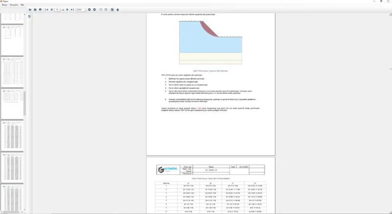 GeoteknikPro Studio Şev modülü ile Şev Stabilite raporu otomatik olarak hazırlanır. Raporlar tam olarak Word formatında alınabilir. Raporlar tamamen düzenlenebilir olarak kullanıcıya sunulur. Tüm hesaplamalara ait tablolar, formüller, kesitler vb. rapor içine otomatik olarak eklenir ve tek tuşla tüm rapor hazır hale gelir.